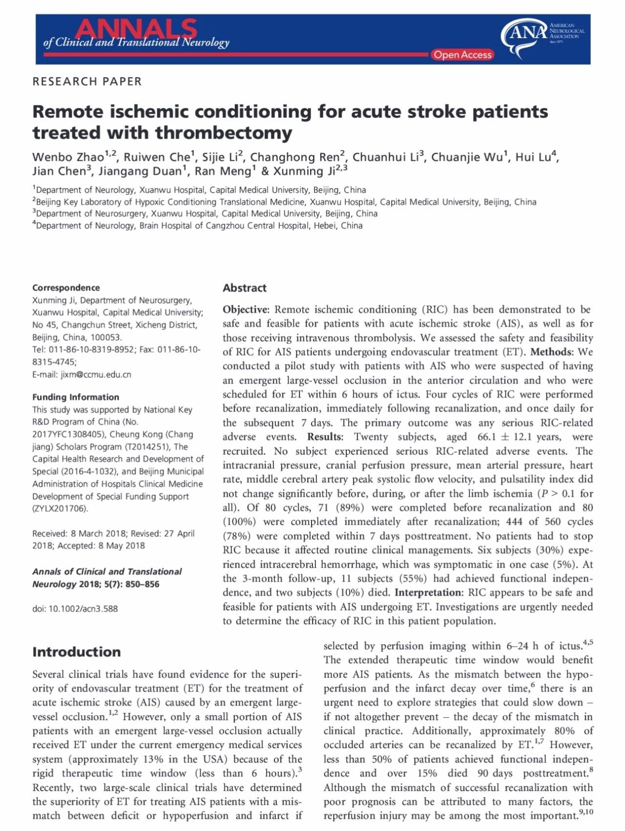 吉训明教授团队首次证实远隔缺血适应对急性缺血性卒中血管内治疗患者安全、可行
